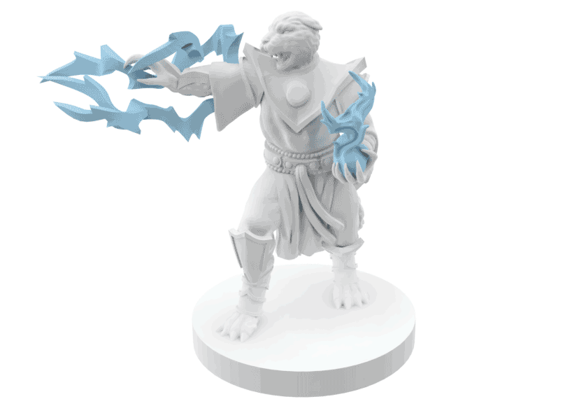 NOTE: In the image below, the top spell effect has a 90 degree angle near the peg that slots into the top of the sorcerer’s arm. The peg will fit into the arm slot one way, so do not attempt to force it as you may break the miniature or spell effect. This top lightning spell effect can be reshaped by rotating the peg arm just past the 90 degree angle so as to avoid touching the miniature’s arm/hand like example B below. Or you can just leave the top lightning spell effect as it is and gently place the smaller arc to rest on the hand after putting it in the slot as would be similar to example A.